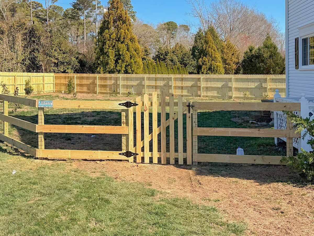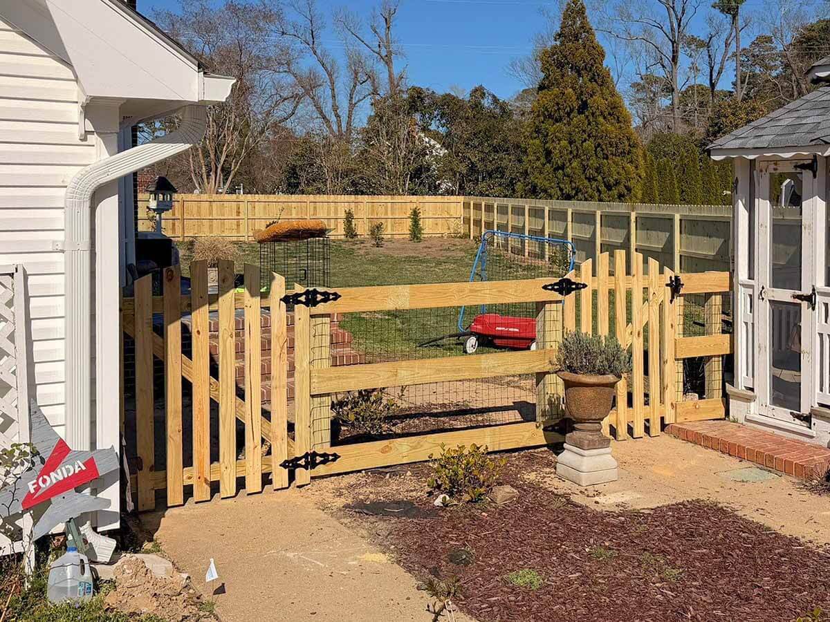 We build custom gates for vinyl, wood, aluminum, and chain link fences throughout Northeast North Carolina communities. Whether you need a single walk gate, double drive gate, or specialty access gate, we design and install gates that match your existing fence and meet your functional needs.